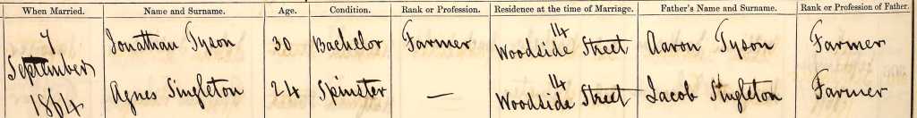 The 1870 US census return shows Jonathan Tyson, 35, living with his wife Agness, 30 and also from England, and an infant son, Aaron, born the previous December. The naming of his son Aaron (Jonathan’s father’s name) suggested that this could indeed be my man. I then found on Ancestry the marriage in Liverpool on 7 September 1864, of Jonathan Tyson, son of Aaron, and Agnes Singleton, daughter of Jacob.