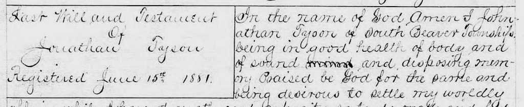 By the time of the 1880 census the family was registered in South Beaver Township. Jonathan was described as a Farmer while Agnes was still ‘Keeping House’, but their 11-year old son has changed his name from Aaron to William. At first I thought Jonathan and Agnes must have had two sons but the 1870 census says that Aaron was born in December 1869 and when William married he gave his date of birth as 29 December 1869. They could have been twins, but neither census has two identically-aged boys; each has only one. When he married Maggie B Gesner in 1891, and on later census records, William always gives his name as ‘William A Tyson’ so presumably he was really ‘William Aaron’.